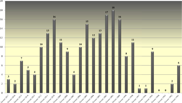 | 2017 | 3 | 223 | 0 | 2 | 1 | 0 | 0 | 0 | 0 |