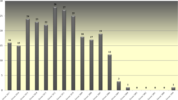 | 2015 | 24 | 1897 | 10 | 2 | 3 | 1 | 0 | 0 | 0 |