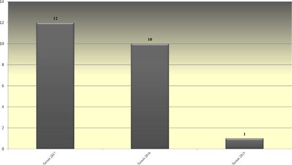 | 2016 | 10 | 700 | 0 | 3 | 0 | 1 | 0 | 0 | 0 |