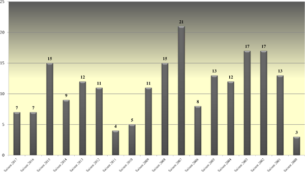 | 2017 | 7 | 540 | 0 | 0 | 2 | 0 | 0 | 0 | 0 |