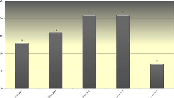 | 2017 | 13 | 993 | 6 | 5 | 0 | 0 | 0 | 0 | 0 |
