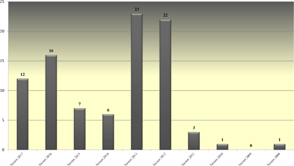 | 2017 | 12 | 692 | 4 | 6 | 4 | 0 | 0 | 0 | 0 |
